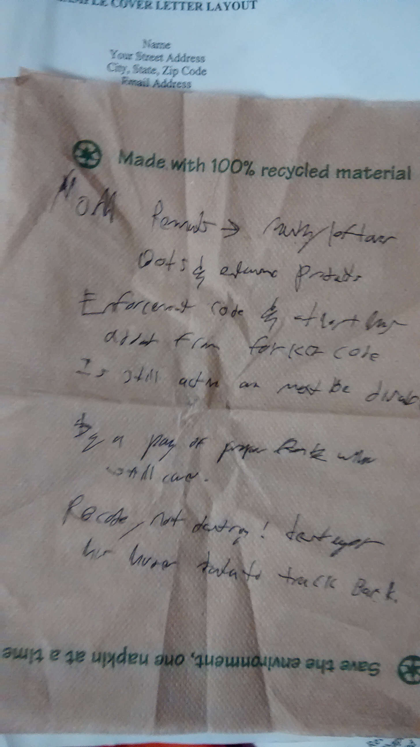 So… NAPKINS. Sometimes when I’m eating lunch, I’ll start having idle thoughts or whatever. Typically, there might be a napkin nearby and a pen in my pocket, so sometimes I’ll just grab a napkin to jot a note for later and then stuff that in a pocket. Often, the napkins don’t make it back to my room without me accidentally discarding them, but sometimes they do make it back.