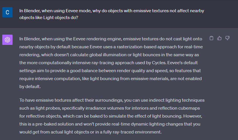 After some frustration I popped into ChatGPT to ask why my emissive materials weren’t having the effect on the scene that I expected.