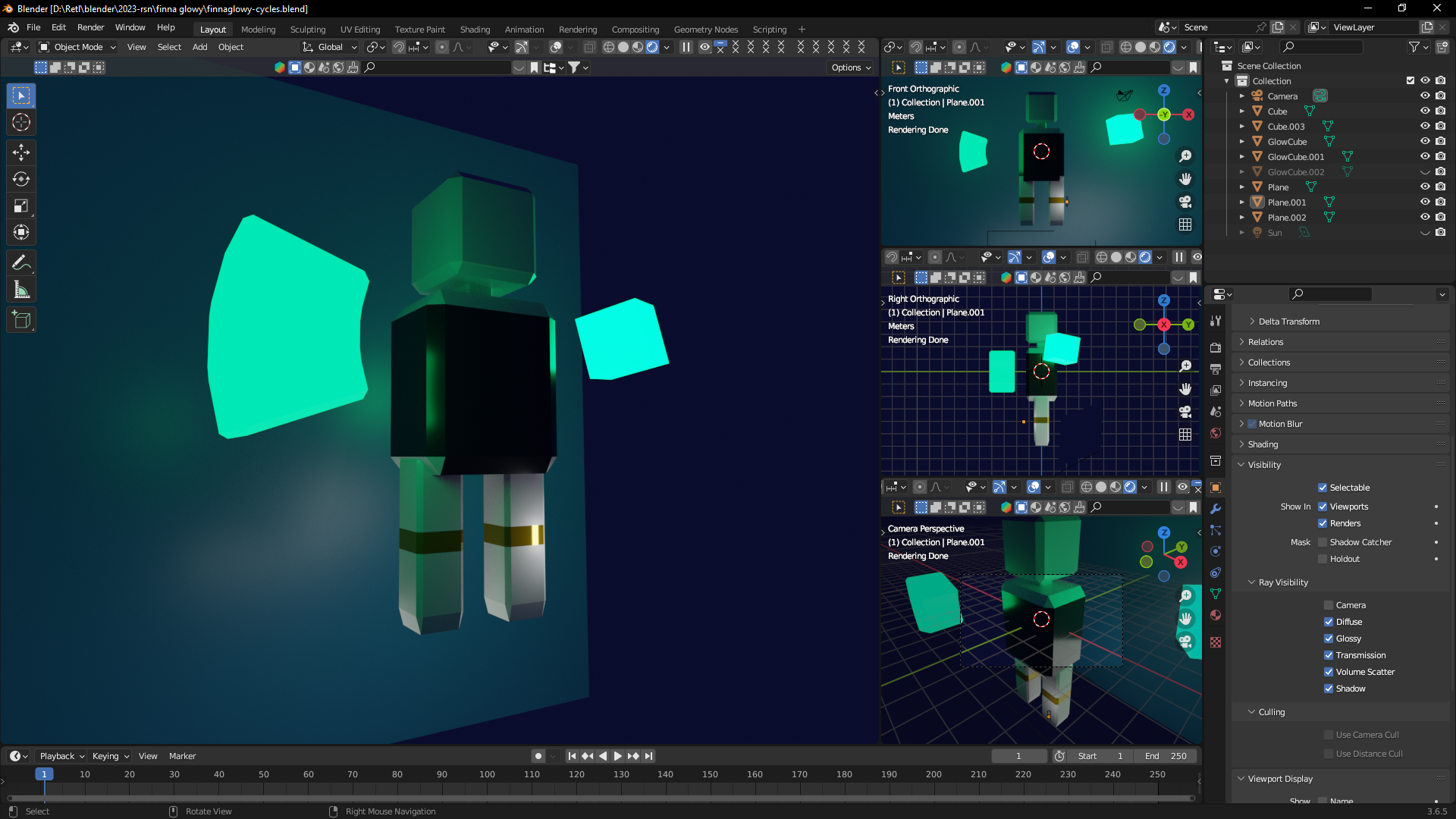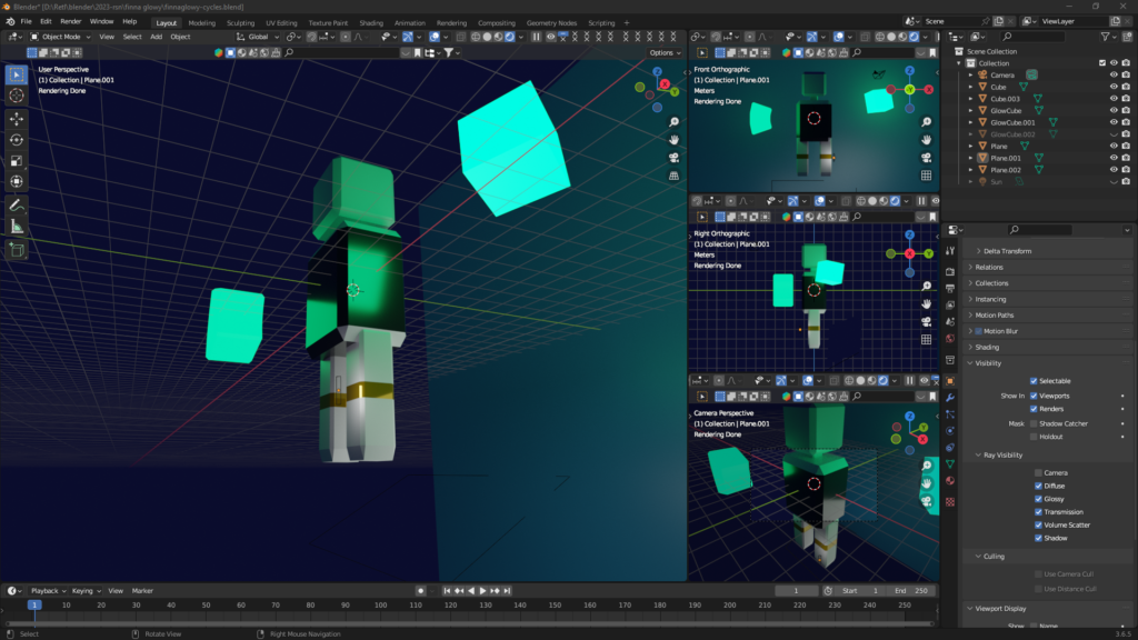 In this case, I wasn’t bothered about trying to match up all of the details of the character’s figure since I only had about an hour or two that I was willing to spend for the night. So I threw together a very simplistic figure from some beveled cubes and mostly focused on figuring out the lights.