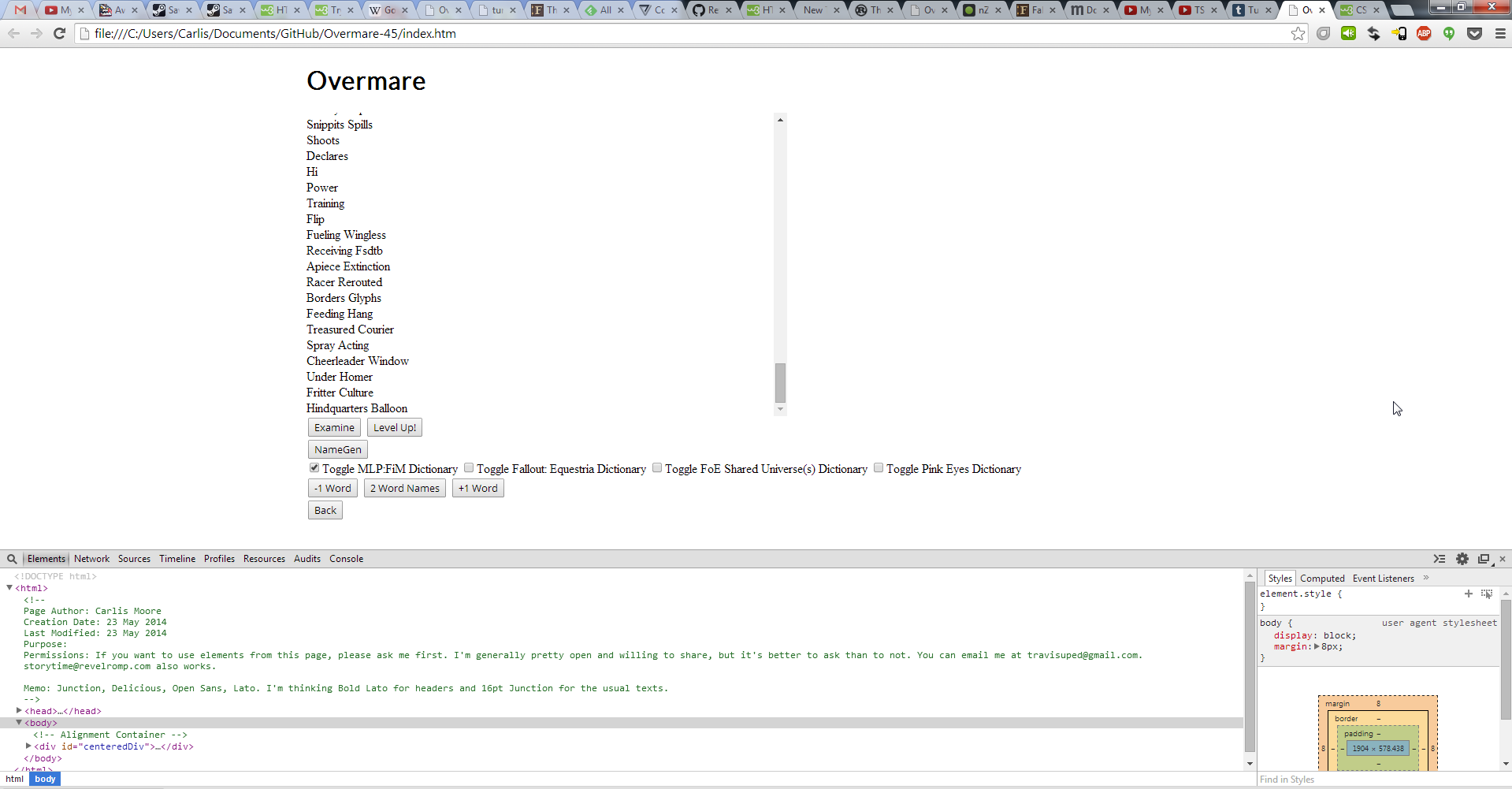 Worked on namegen. SPECIAL is now randomly generated. Characters that are given level-ups will spend 10 skill points with every in-game tick when they have 10 to spend. I should probably make it so that they can eat. Which would require settlements having food. Thinking about working on regions soon, which would represent the general areas that the settlements are being made in. Also changed the skills listing back so that they use the same skillset as FoE PnP Revised Rules.