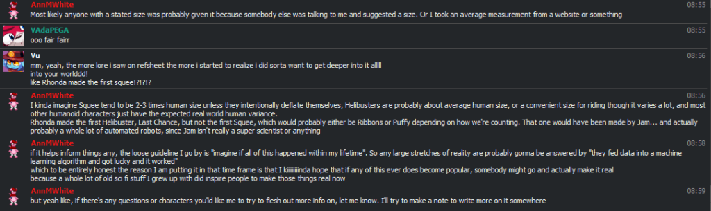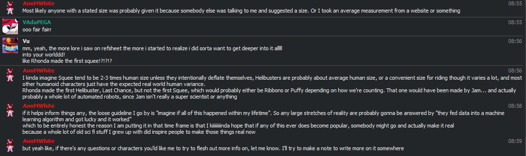 I used to personally use the username RevelRomp in a lot of places before having the RevelRomp Dalliance and the Dalliance Arms Corporation have a major role in Yozh Hylan. Now I usually go by Ann in honor of my late mother. That was following a relatively short lived transition to AnnieWuzOK, which was a pun on Annie Mae / Anne May from a Havoc Fox “anime” joke Dusky once made. Before that I tried names like Retl (which I dropped because search engines would autocorrect to Retail), Kahli Lh’tail (an audio corruption of my first and middle names), Kilo ( still like that name honestly, but it keeps being associated with drugs), MollyJTG (loosely inspired by Molly Fyde and by Holly Songsteel, a character I had for a short lived DnD Campaign), Travisuped (I barely remember how this came about, I think I was thinking of “Upped” as in powered-up and Travis because of some anime I had seen around the same time I was playing Quake 3 Arena Demo or Unreal Tournament Demo on Dreamcast for my first time with a cousin that was visiting), NTU (a terrible alt name I kinda regret ever using), Mask11US (the first username I ever had), Scalebea.sts#0777 (a name I using as a “band” for the music I made for the games I wanted to work on for my LLC, I haven’t done much with it lately and have since kinda pivoted towards rebranding it Zephrybeasts to better tie in with the Beast Balloons and the idea of Zephyrkin), and Fickle Luminescence (which I feel kinda reflects my actual behavior of jumping around interests somewhat erratically, and a persisting fondness for colorful and pretty glowing lights and holograms and cyberspace digital world vibes).