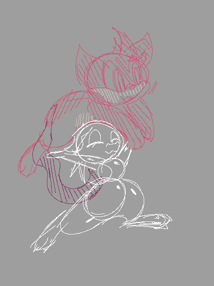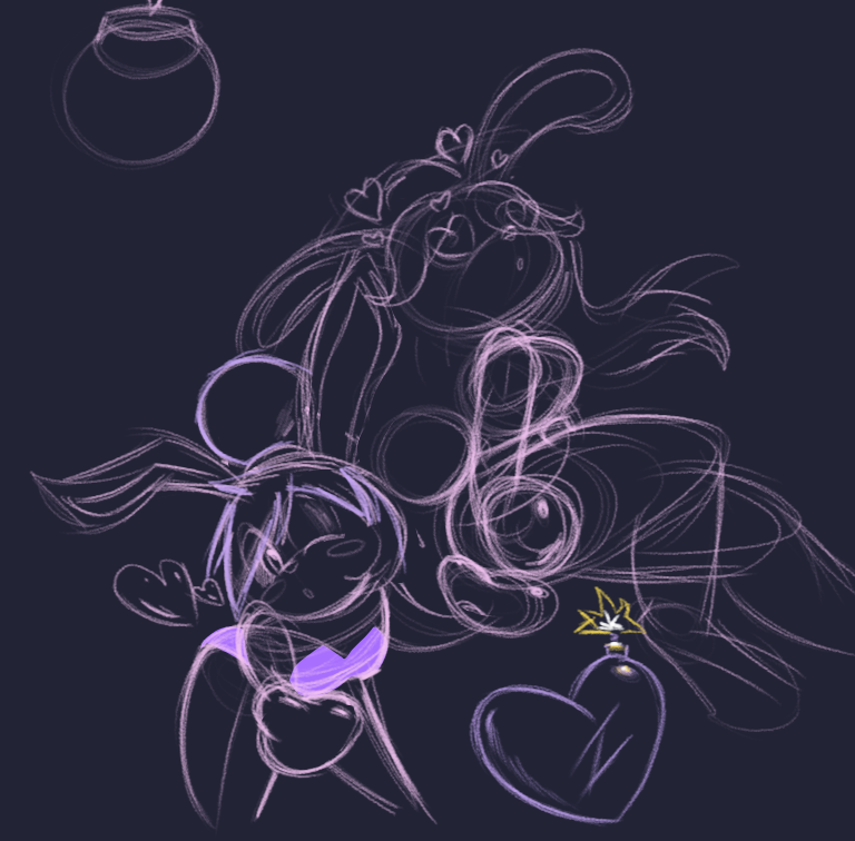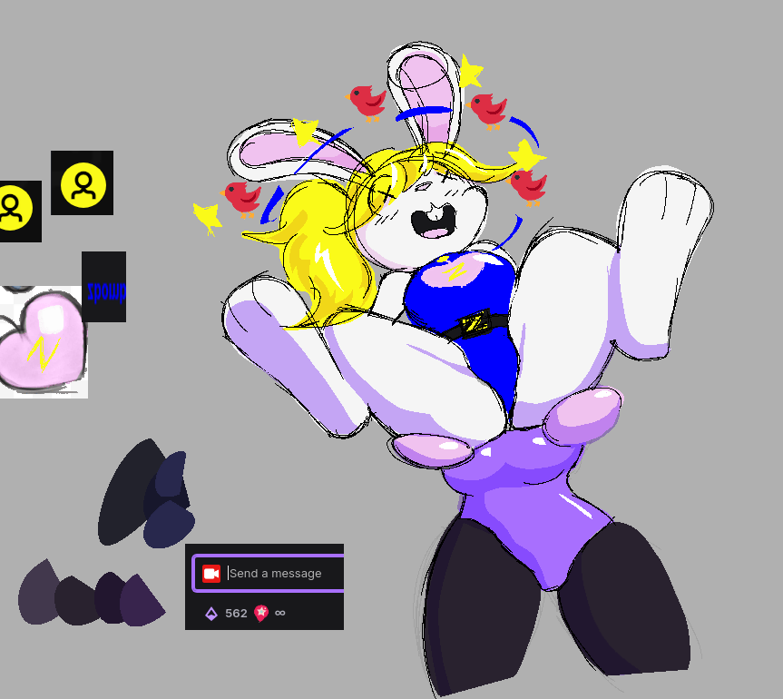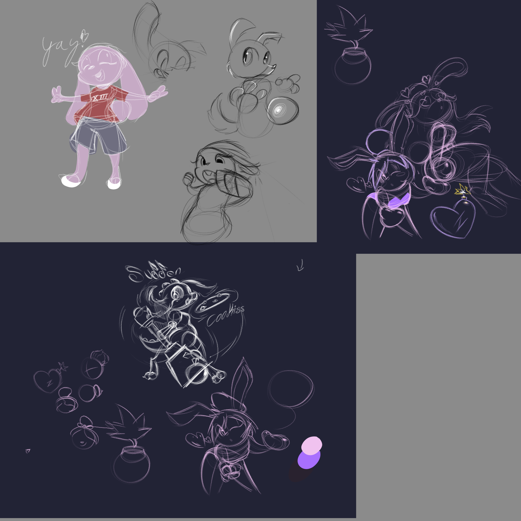 At the bottom is a doodle for zbombiibunnii. They were *very* clear that being lifted up by the buns, having the crosses on the eyes, and having dizzy birds/stars were very important to them. I got the distinct vibe that this was a kink type request from somebody who is still kinda self-conscious about their interest, so I did the second balloon-centric thing to kinda show what I meant that what they were asking for isn’t that far off from what I spent almost 20 years drawing to begin with. Either way, the bomberman-themed-bunny character isn’t one that they specifically asked for, I kinda came up that spur of the moment based on the reference album they sent over. And from the sound of things they were very happy with it. When they asked what the name of the character is, I went with “zbombiibunnii for now”. They also said they imagined that the person lifting up their character might be Dark Zbombiibunnii, which I think is kinda cute and that’s what lead to the color choices there. Buuuut I probably need to like, actually take the time to draw out both characters less visually obscured if this is going to become a recurring thing. I don’t normally do art commissions because the stress of formal commission arrangements makes it hard for me to get anything done. But doing informal requests for subscribers or familiar faces doesn’t stress me out quite as much and it becomes a bit easier for us to kinda find a cozy midpoint between me being a bit easy on the effort and them not having to overpay for work I don’t feel I can deliver. Or. Something.