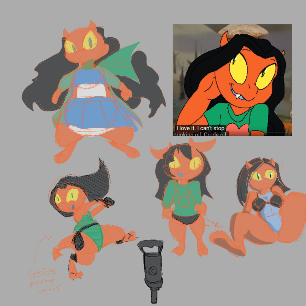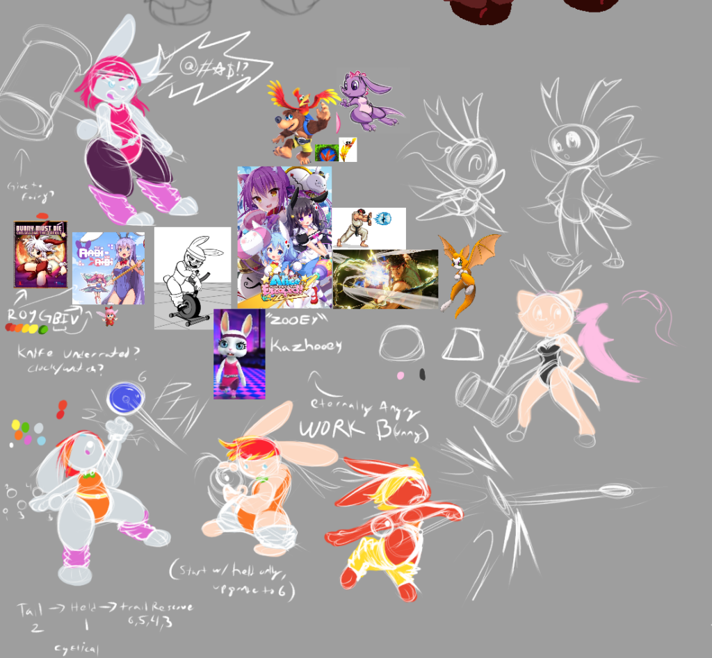 I think Kazhooey is still _too_ close to her inspiration character too, but I’m pretty sure the Zoobe company is defunct anyway so I’m not worried about legal action coming of it. But I don’t want want to set optics of being super lazy copy-paste without a cohesive vision behind it. Firey orange and reds feel a lot more “right” to me for the spirit of the character. Maybe just need to bring back in the dark leggings to that bottom-left iteration for the color contrast. Like, I really want Zooey to be as much of a firebrand as Kazooie and the Zoobe Bunny herself, but still trying to do the Right Thing (most of the time) despite a tendency towards explosive rage and self-focused goals.