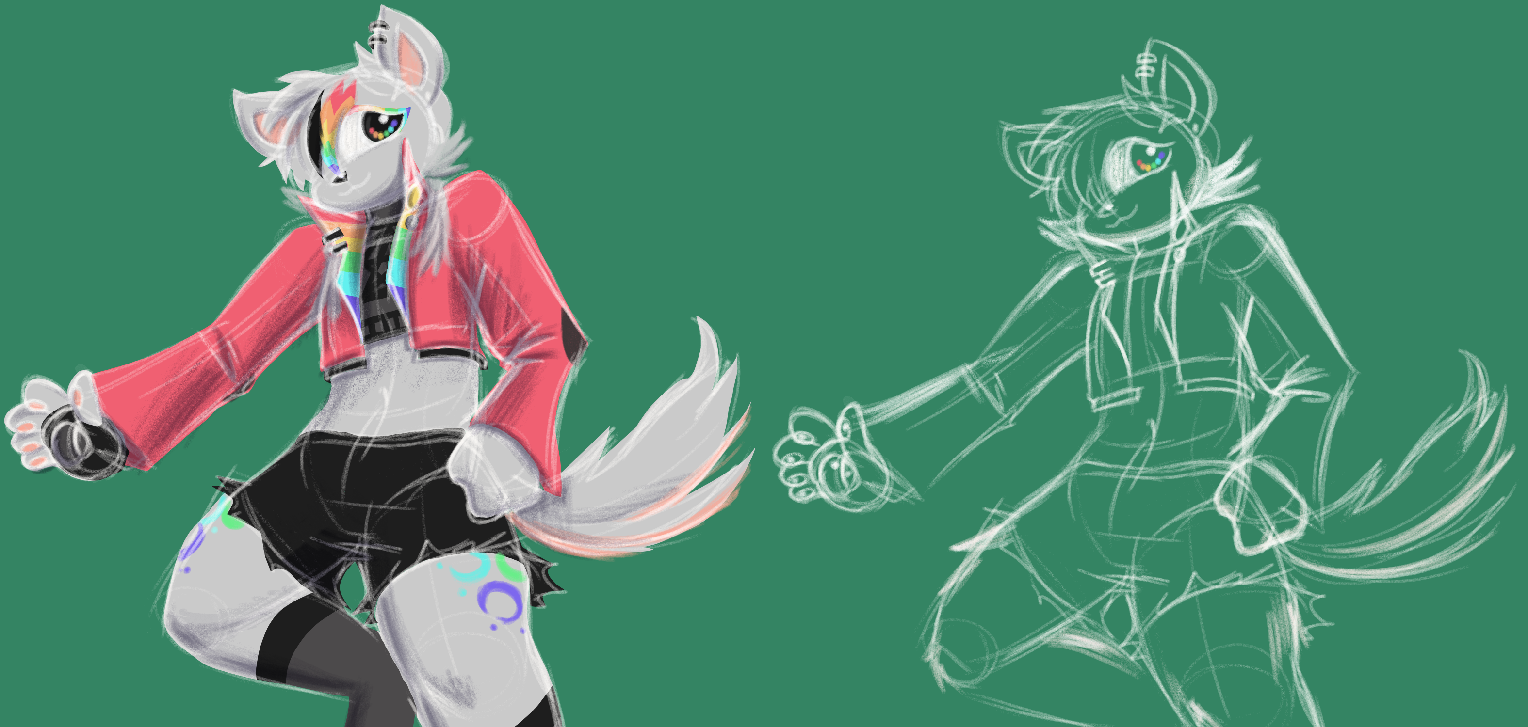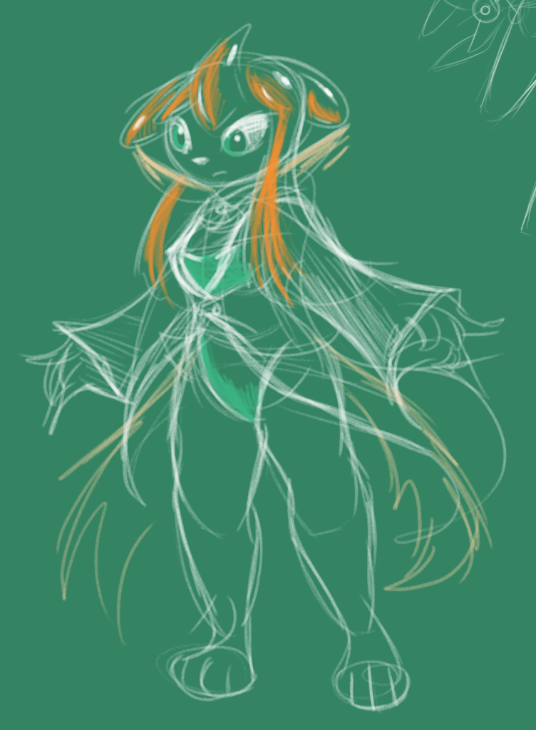 And then there’s making things that are intended primarily for a friend, or a client, or to be shared with strangers. The entire value assessment shifts into a zone that kinda depends on feedback of those social connections to others, with a little bit of the personal curation coming through as a matter of what feels good or reasonable to one’s self, and as a matter of considering social consequences of the things being made. When we are Making for Friends or Making for Others, we are almost always using a very different underlying ruleset than we do when we are Making things for Ourselves. Because a lot of things that we can do to get practical information for next steps and then discard once we reach that next step take on a different meaning and feeling when it is instead something that everyone sees and forms opinions about, intentional or not. I might spend a week going through two or three pages worth of funky incomplete sketchbook doodles before one of the ideas latches on in a way that I genuinely feel I want to explore and flesh out. And then even with that one thing I might drop it after a day or two, or I might forget it exists overnight, or I might get really excited for a month and start doodling it multiple times across friendly drawpiles or request streams and the like.