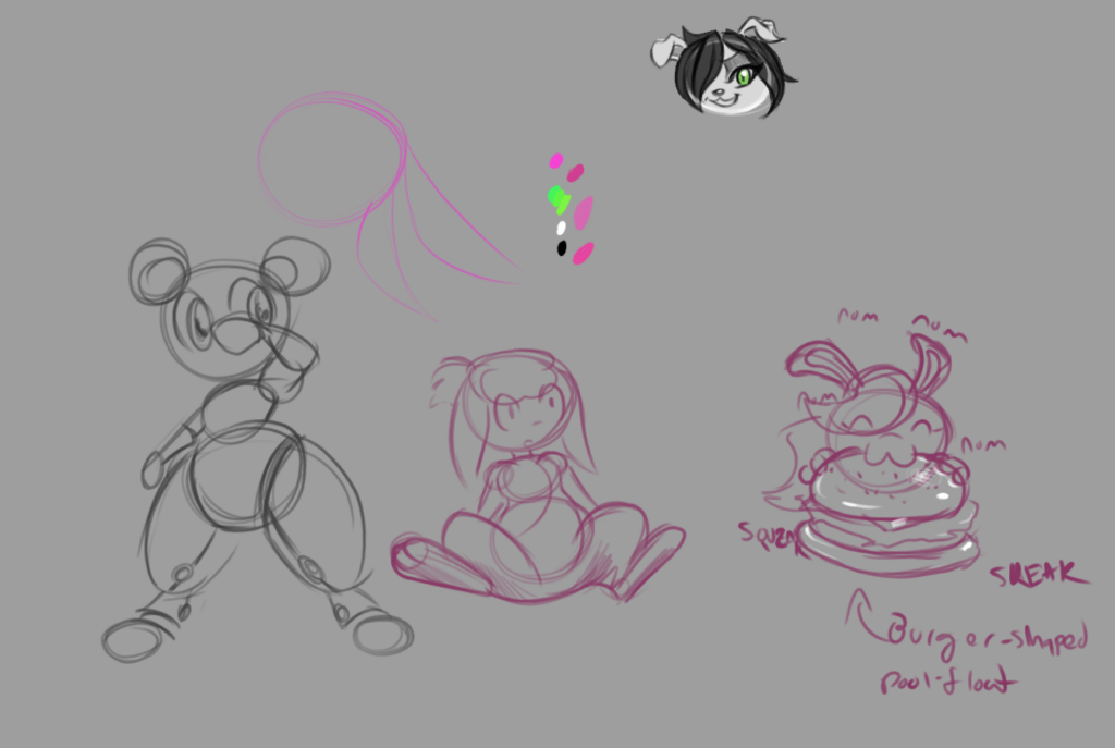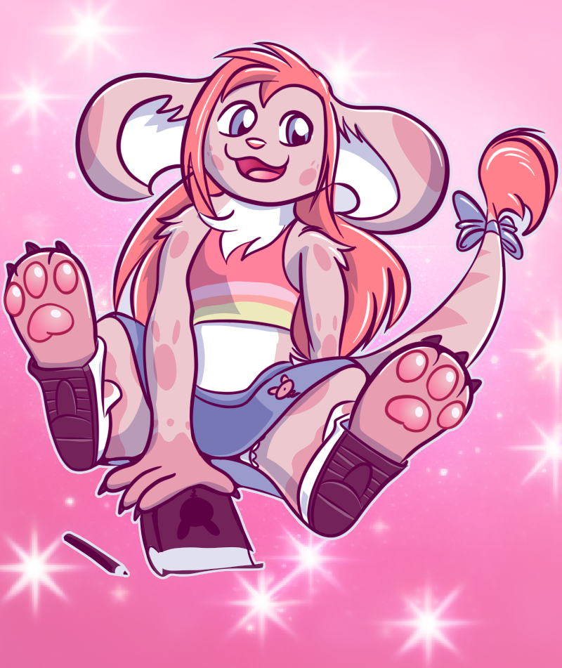 I’m still not sure what the best way is to label whatever it is I’m doing. Most of the stuff I make isn’t as overtly kink-coded as it used to be as my libido is starting to go. I used to think the best approach would be to treat things that had erotic intent exactly the same as pornography and treat things that weren’t exactly the same as any other “tame” thing regardless of how it looks outwardly, but after a while it became painfully evident that the binary “is or isn’t mature” doesn’t work very well at all. I think my current approach is to just go by feel, but otherwise claim the bulk of what I make would be under the bulk category of “Probably nothing too out of place from what teens will experience, but it’s targeting adults who adore the bright and cute aesthetics but still want topics and situations that are treated for as nuanced and complicated as they often are.” So then I look at stuff I draw like this particular ZbombiiBunni sketch and my first thought is “ehhh, this is maybe a little too suggestive and bodily-objectifying than I’d really like to be known for.” But I think I did a fair mix of sticking to the general aesthetic tastes I already like, and stuff that I think really targets what Bombii wanted.