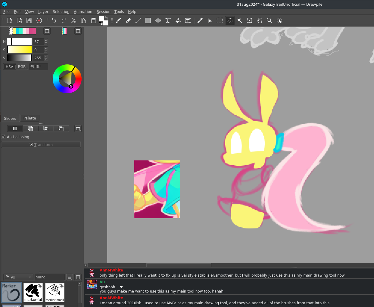 Seems like Drawpile 2.2.2 has anti-aliasing for the freehand select tool, which is it main thing that made me favor using Paint Tool SAI 2 for coloring than anything else, so… I might actually make Drawpile my main drawing tool once I find another sketching brush I really like