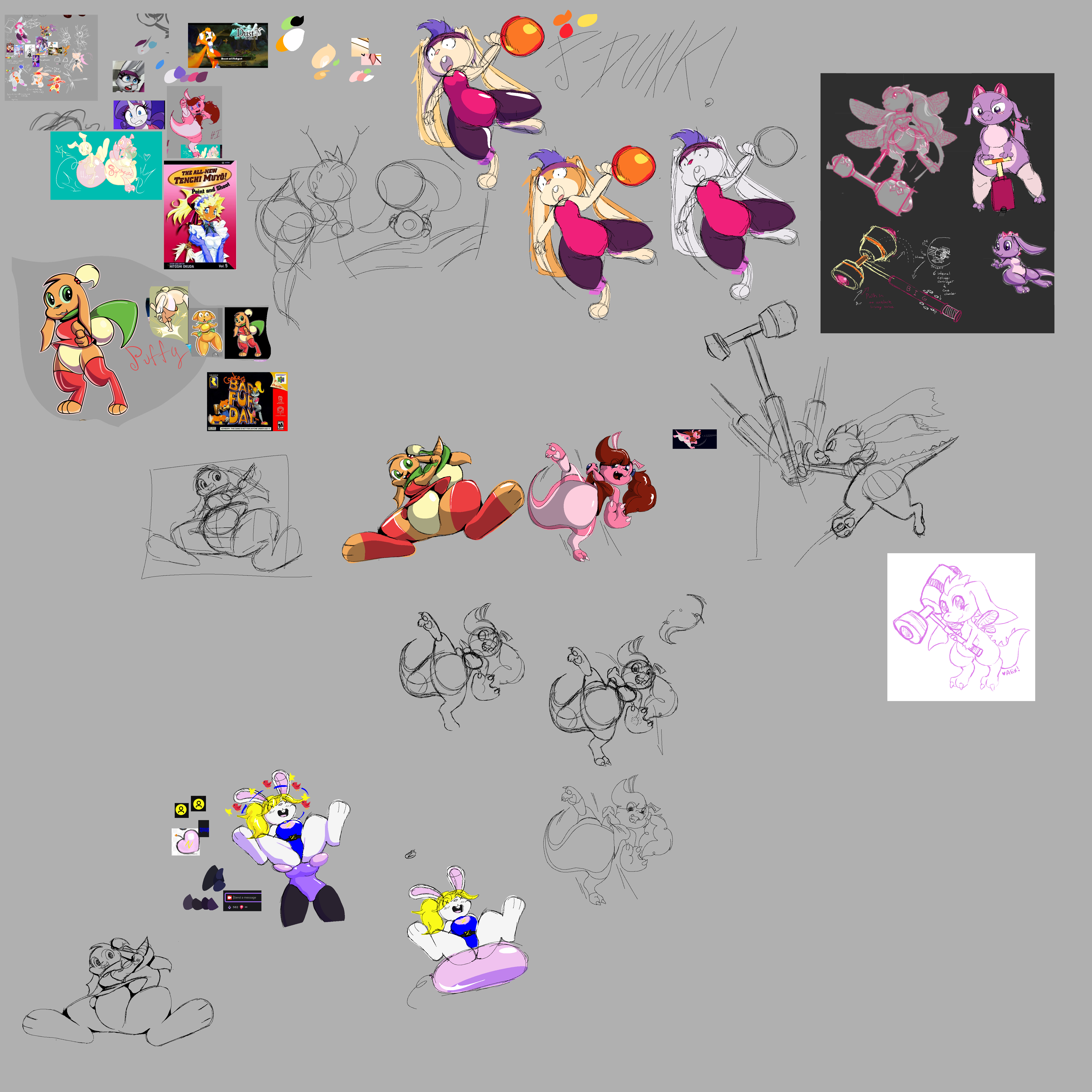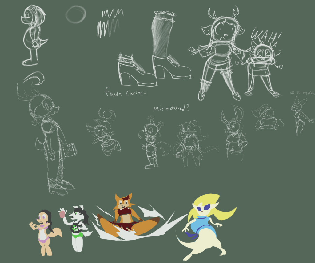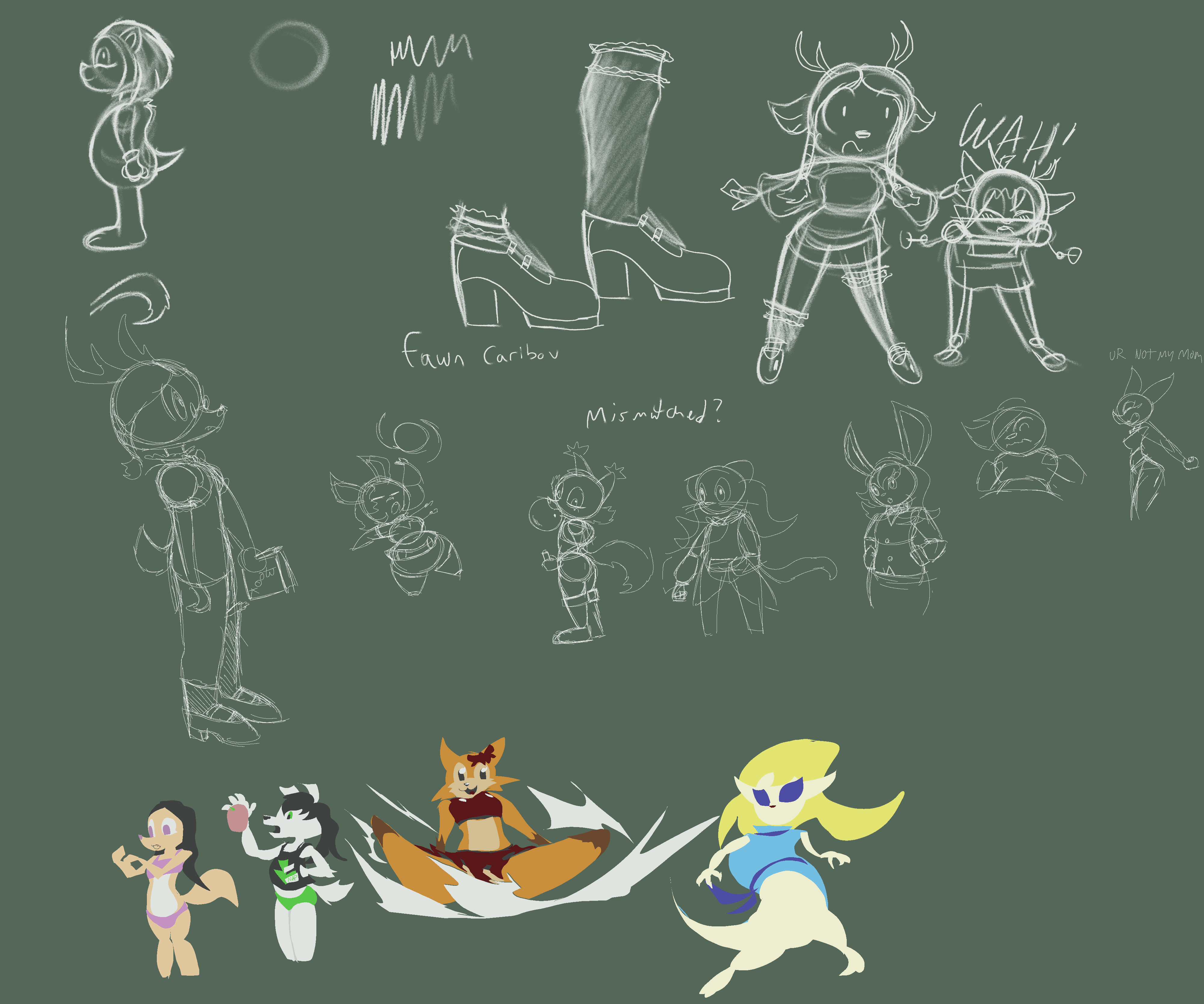 A lot of half-doodles and reworks and color swatches kinda tossed about the page. Also you can see where I was trying to revisit the design for Zooey again. This time I was trying to take some of the yellow/orange I like from Tails (Prower) and the purple mane from the Rarity fanart animation version of the same Zoobe Luna Fourth of July meme. I was going to keep most of Rarity’s hair style almost directly in tact, but instead I decided to go with kind of a mohawk sorta look to draw a bit from Kazooie (Banjo-Kazooie)’s visual language. Gives her a silhouette that’s a bit different from most of my characters. I feel pretty sure I’m going to stick with the orange/yellow instead of the white, I’m just now sure how deep I want the orange to be yet. I don’t want it to read as “flesh color” but I don’t want it to be overly abrasive on the eyes either, even if that fits the character’s personality. And I think it reads a bit more clearly that she’s easily agitated, actually kinda loves music and dance, and likes to live open and true to her beliefs one way or another. I assume before the whole encounter with RB, Zooey was a roadie for a small indie band. At some point she probably broke off and used her earnings and loan to setup a recording studio. I have a bunch of other thoughts about this, but I don’t think it’s quite ready to be organized and tossed out as a “plan” yet.