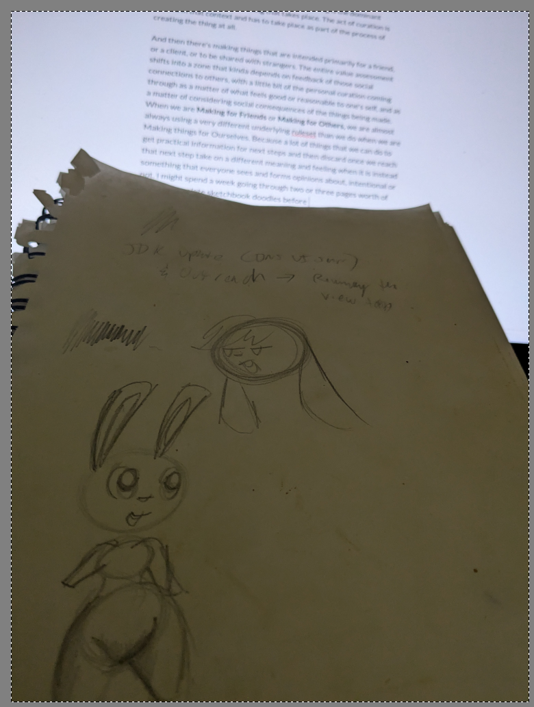Anyway, what I’m finding is that while I do kinda like sharing things with friends, especially when they’re made for friends, I cannot thrive on that energy. I *have* to be making for _myself_ if I want to keep making things. But directly contradictory to that is that I do not like the process of making things. If I could make the ideas in my head a reality without having to do it myself, I absolutely would, and I would enjoy the outcomes immensely, and it’d be a losing die-roll for most of those ideas whether I’d feel like I should share them at all or just keep them to myself.