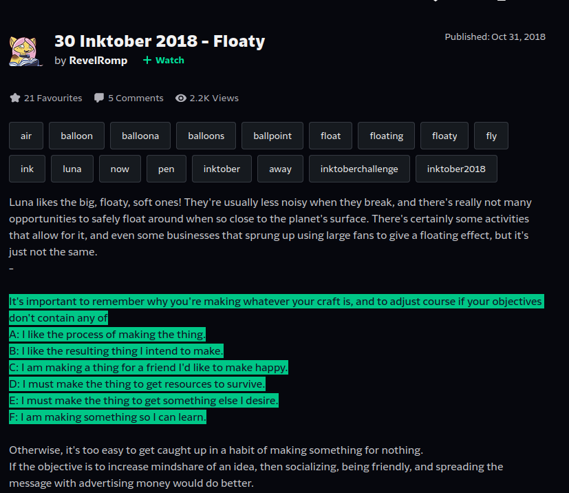 And in those particular cases, the act of sharing the thing that was made is usually a separate decision come up with after-the-fact. The purpose of making the thing was already fulfilled, so sharing it with others is either a byproduct of yet another goal, or a habitual activity, or a social connection task, or any number of things. But it itself is an act separate from creating (usually). Picking which things to share and why is a matter of Curation, which is kind of a subtle art of its own. Choosing and arranging discrete choices is art! Even if it doesn’t really feel like it sometimes.