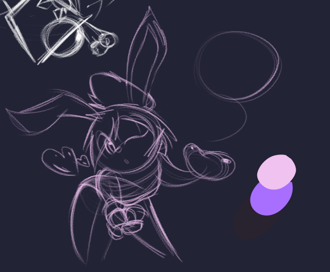 Trying to put some kind of face/design to the “Rogue Fairy” for the “Bunnylike” concept. I’m not really feeling any of these. I started deliberately trying to pull color and form from the look of this one NPC from Arzette because I really like the silly meme that showed up lately and I already liked the character design before, but both of the right-most doodles feel like a Bad Vibe probably because it’s too similar to the source I tried to pull cues from. I don’t _dislike_ the bottom-left one, but I don’t like it. The top-left looks cool, but they feel like some other NPC, not an over-exuberant devotee of bunnykind.