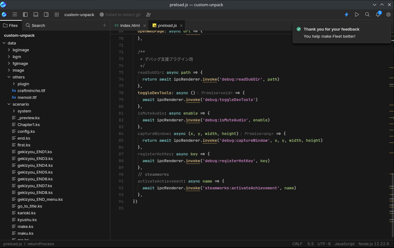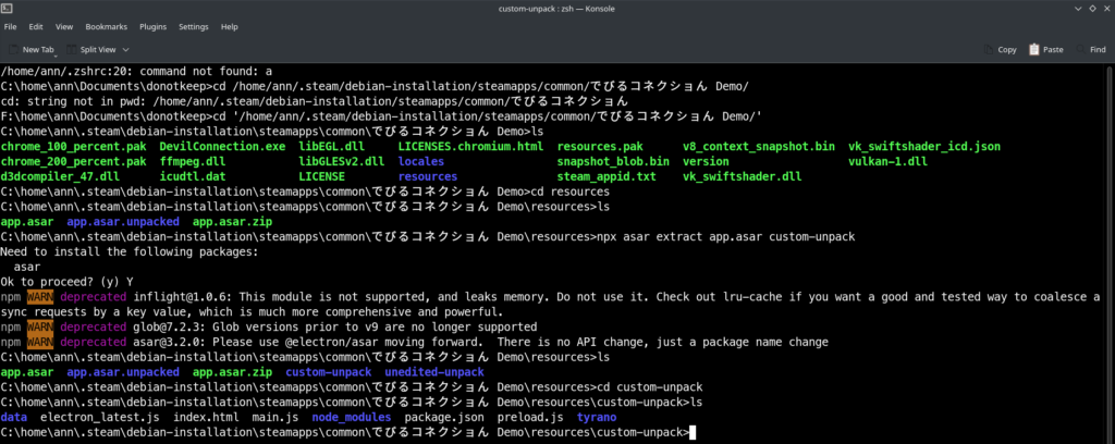 I see a lot of .pak files in locales that seems like it might be the game pre-translated! …wait no that doesn’t make sense, the game has only ever been shown in Japanese. those must be translation files for Chrome itself. In resources I see app.asar. I don’t remember what an asar file is, but it sure feels familiar. Is it a zip file? No. Renaming it to .zip and extracting with Ark does not work. So back to google. And sure enough, more confirmation that this is almost certainly an Electron app. Doesn’t take long to find the info on how to pack and extract an asar file.